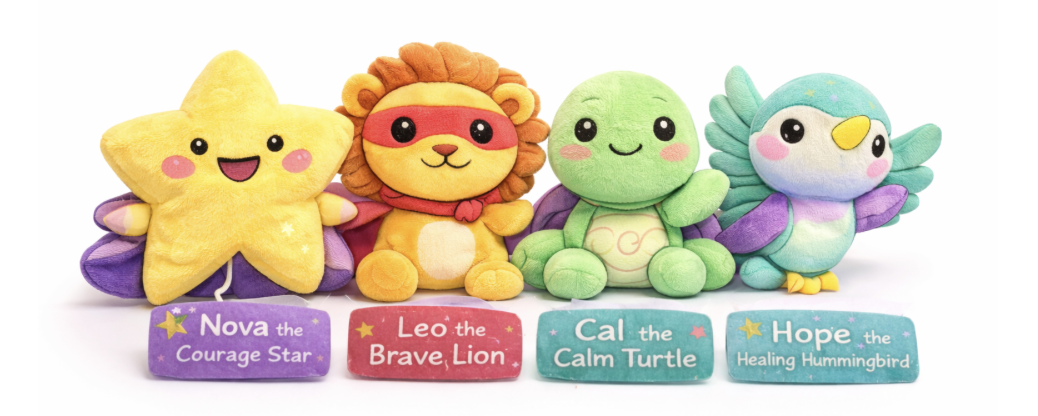 Nova is a small star from the Courage Galaxy who travels to Earth to help kids feel brave during tough days. With a gentle glow and a tiny cape, Nova reminds every child that their light shines even in the darkest moments.